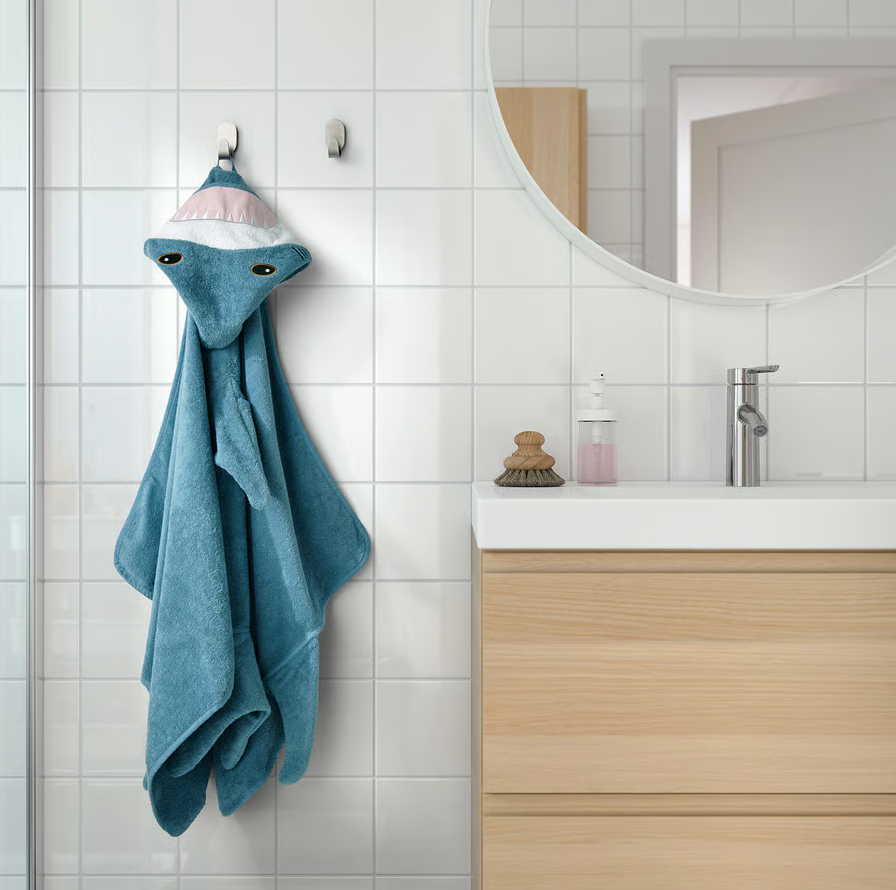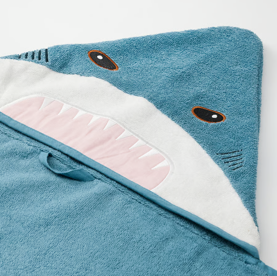 This large towel with a hood can transform your newly bathed child into a live blue shark with both back and tail fins. Woven from warming cotton terry that feels soft against the skin.